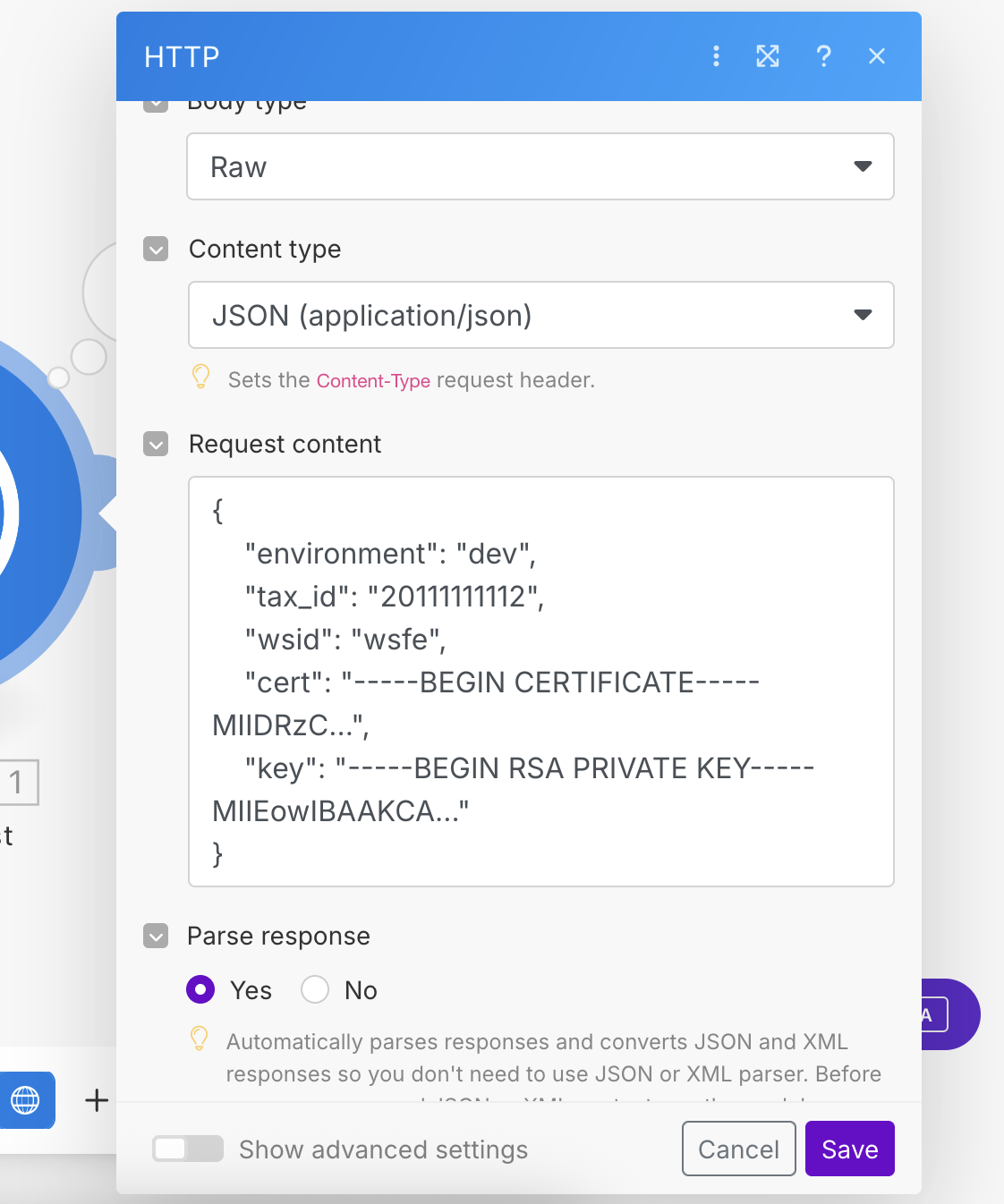 Al pedir la autorización agregamos `cert` y `key` en el Request content