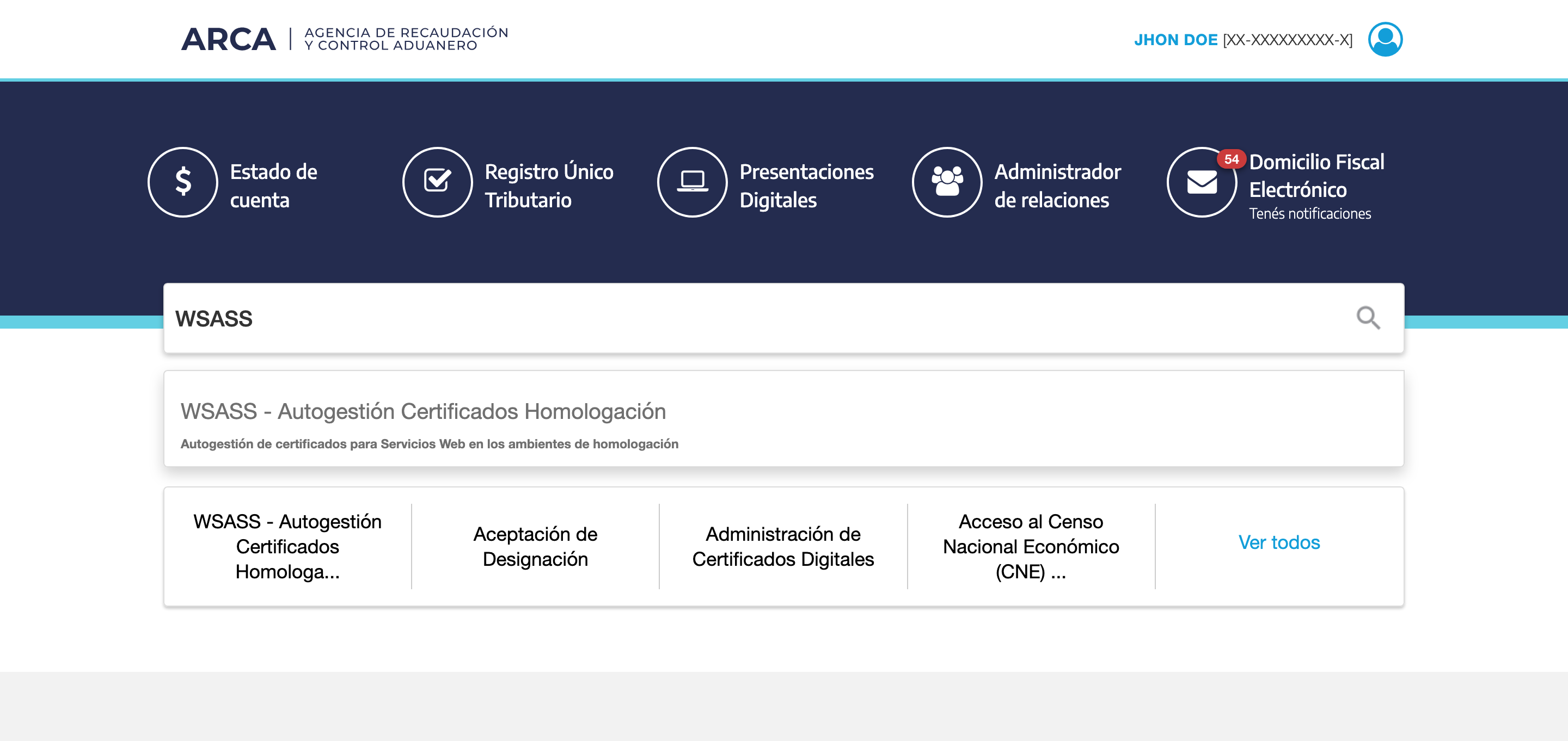 Dentro de nuestro escritorio de ARCA debemos ingresar en **«WSASS - Autogestión Certificados Homologación»**